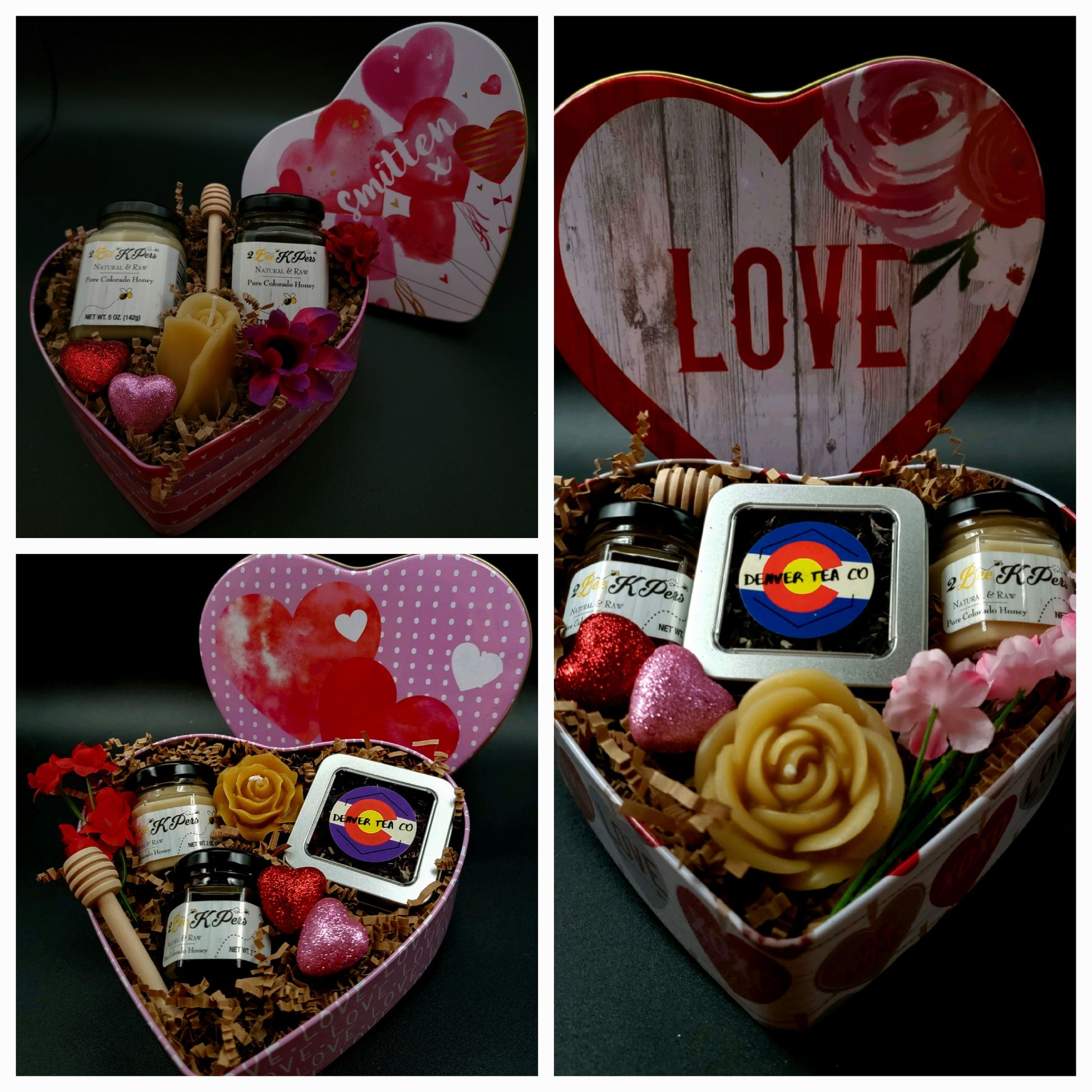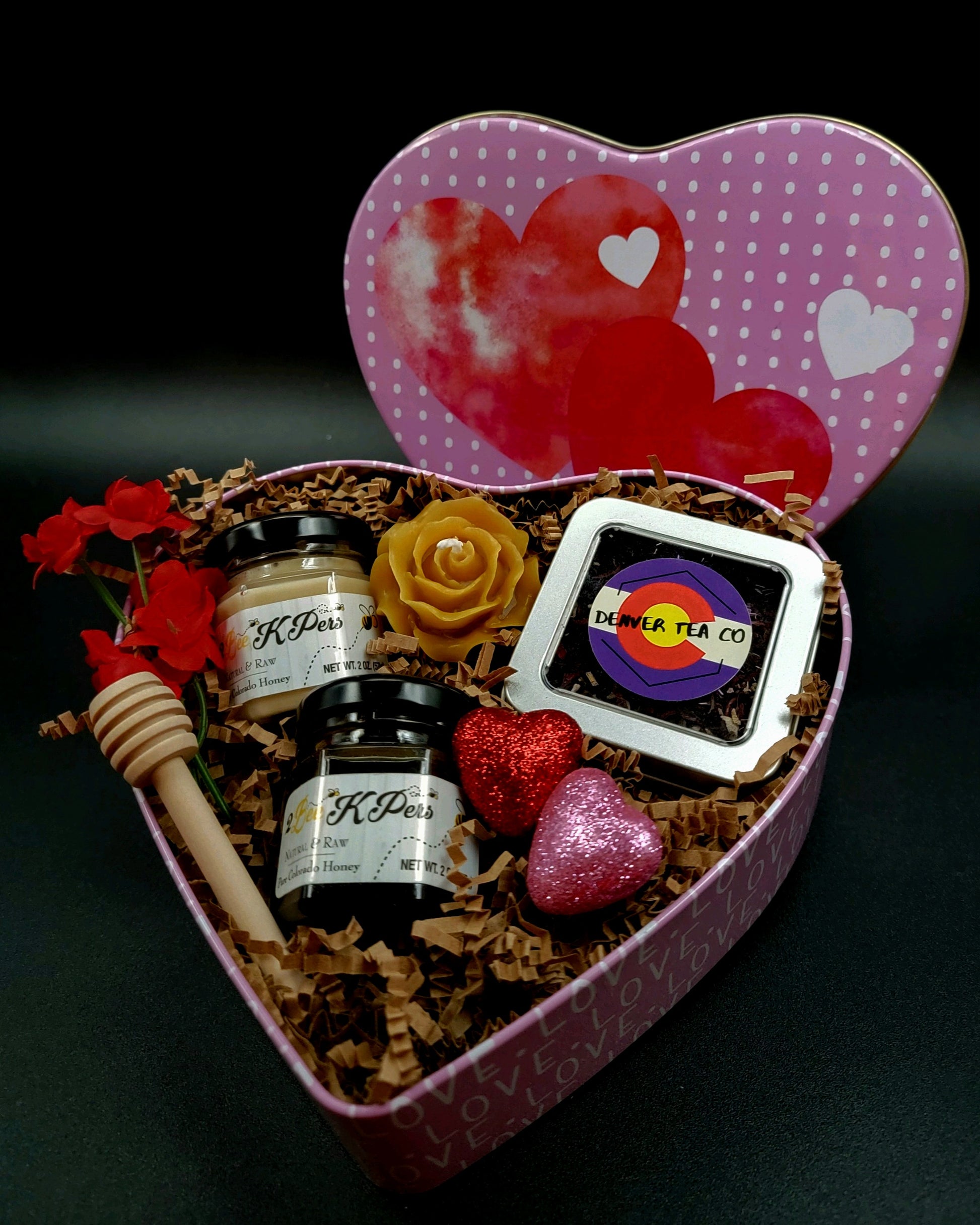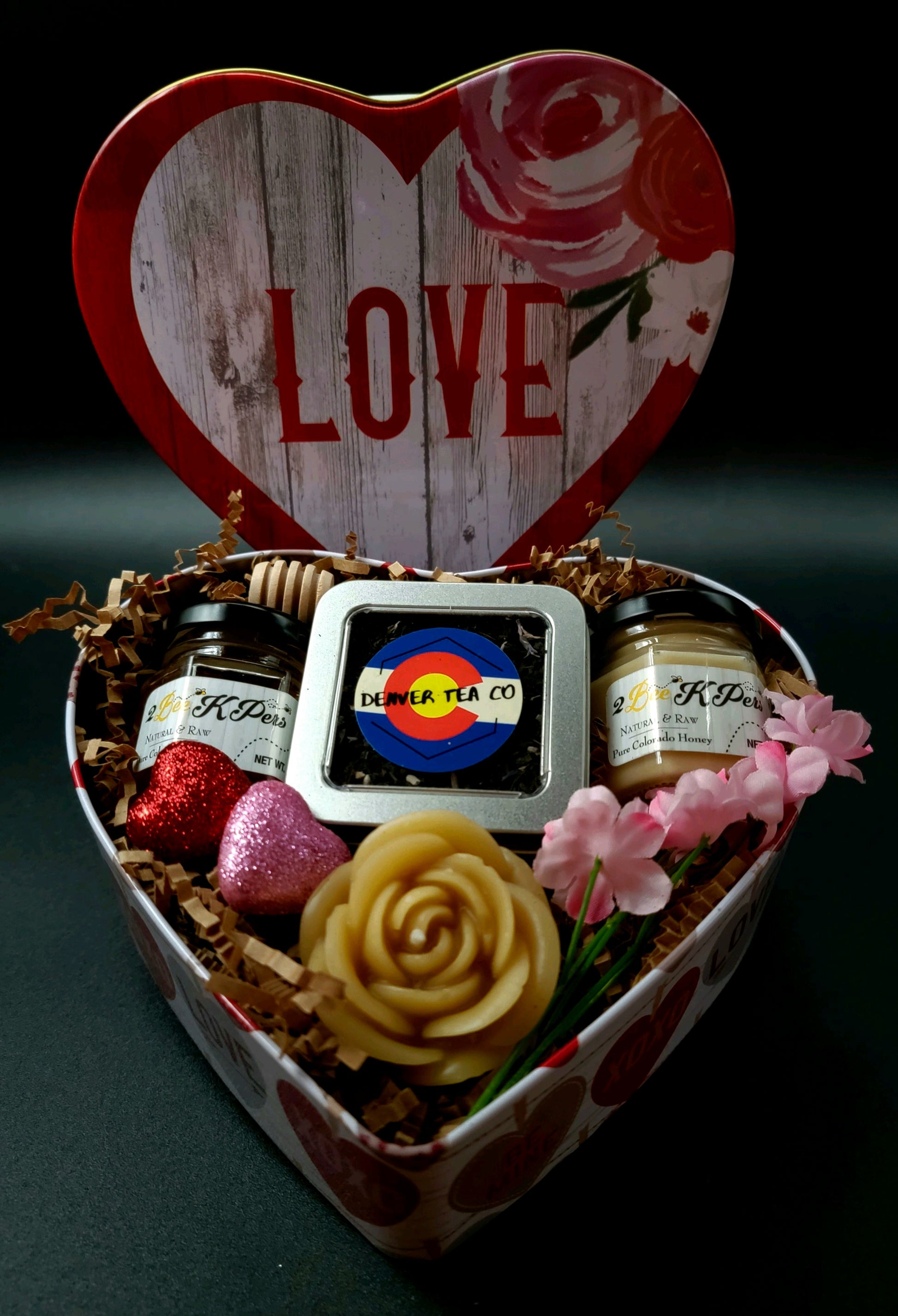 A heart-shaped tin filled with a variety of honey jars, beeswax candles, and loose-leaf tea.