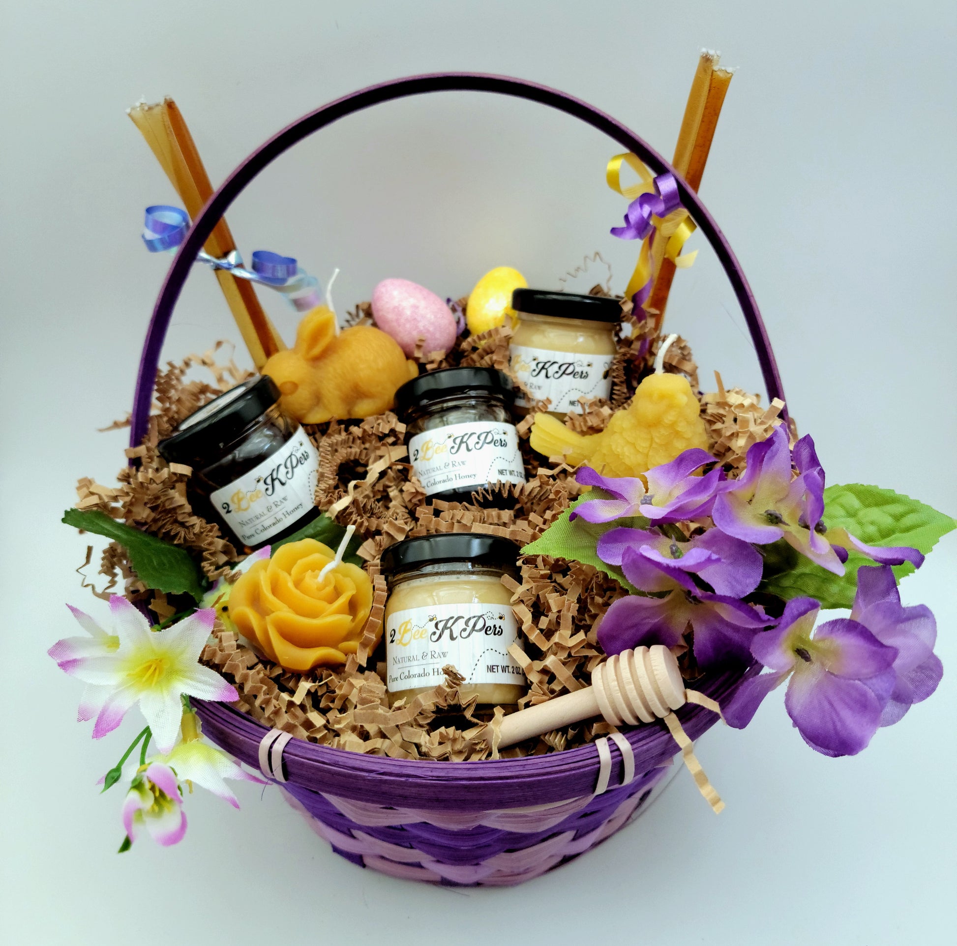 A purple gift basket filled with a variety of honey taster jars, honey stix, and Spring-themed beeswax candles. Dimensions: 9"w x 5"h.