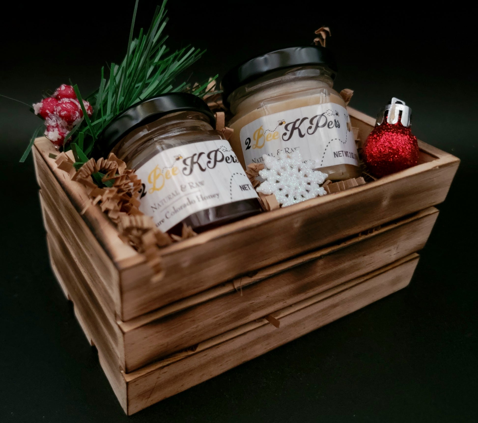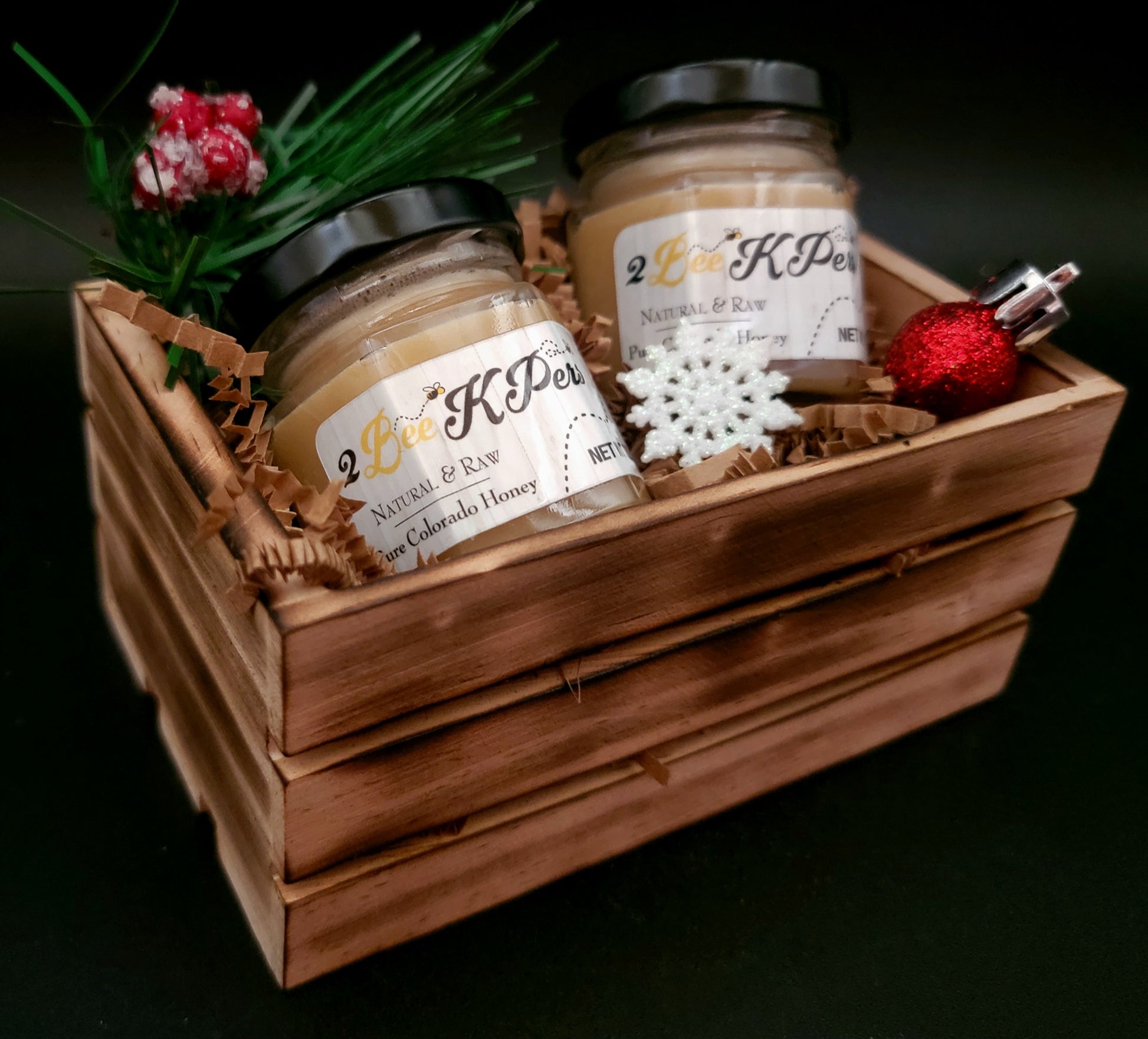A mini natural wood crate decorated with holiday flair, filled with your choice of 2 items. Select from small honey jars and festive beeswax candles.